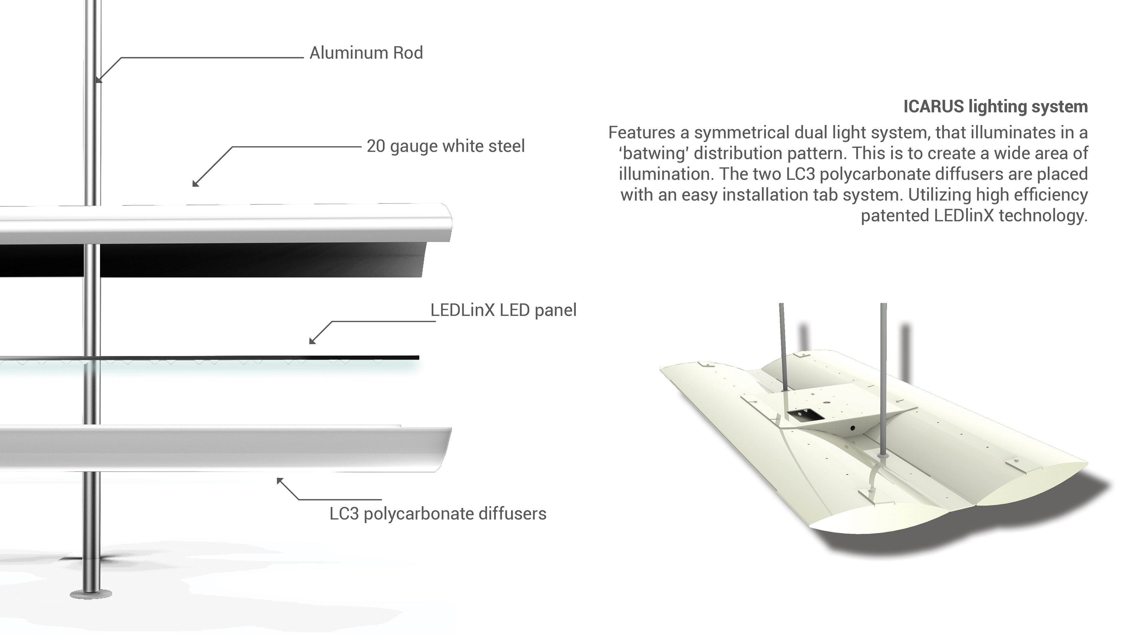 ICARUS lighting system is a symmetrical dual light system, that illuminates in a ‘batwing’ distribution pattern. This is to create a wide area of illumination. The two LC3 polycarbonate diffusers are placed with an easy installation tab system. Utilizing high efficiency patented LEDlinX technology.